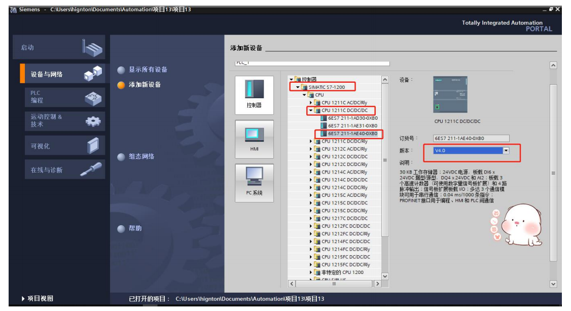 2.打開博圖軟件,新建項(xiàng)目、添加設(shè)備,找到對應(yīng)設(shè)備系列、型號、版本等,添加。