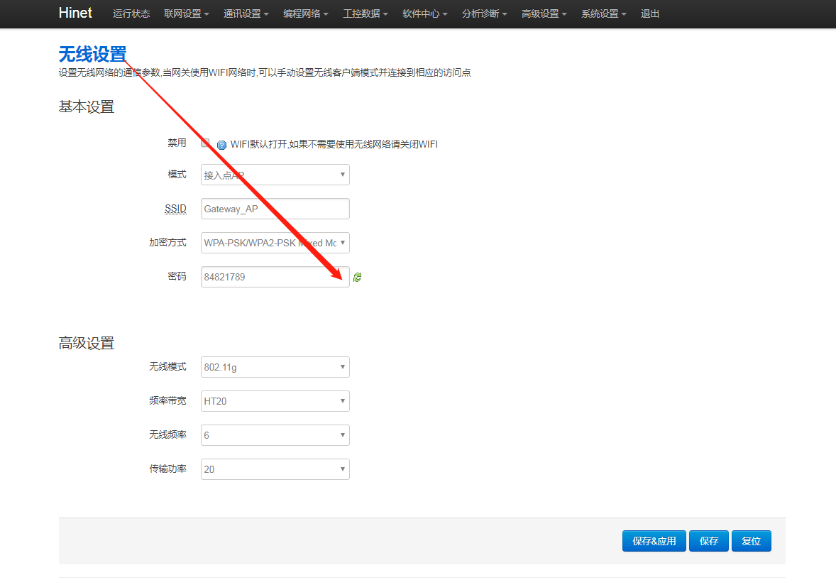 2.WIFI密碼是否正確,進(jìn)網(wǎng)關(guān)后臺,點(diǎn)擊“通訊設(shè)置 - 無線設(shè)置”,點(diǎn)擊顯示密碼圖標(biāo),確認(rèn)密碼。